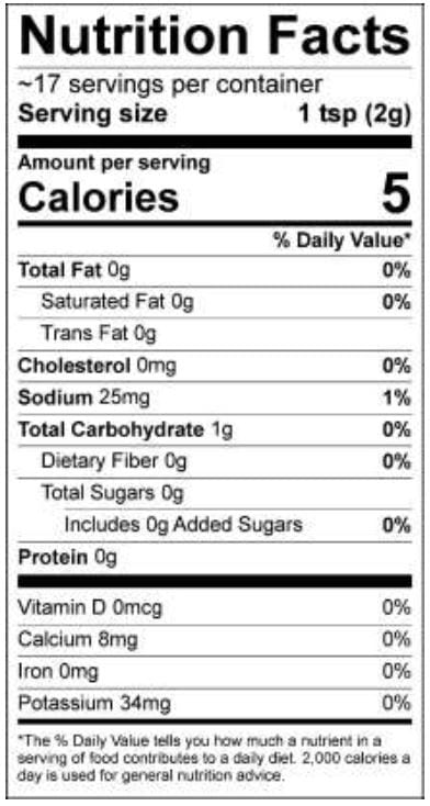 Dehydrated spinach, dehydrated onion, dehydrated parsley, dehydrated bell pepper, celery seed, vegetable broth powder (corn syrup solids, tomato, salt, dehydrated onion, dehydrated garlic, autolyzed yeast extract, carrot, basil, celery seed, kelp, parsley, spinach, tumeric, bay).